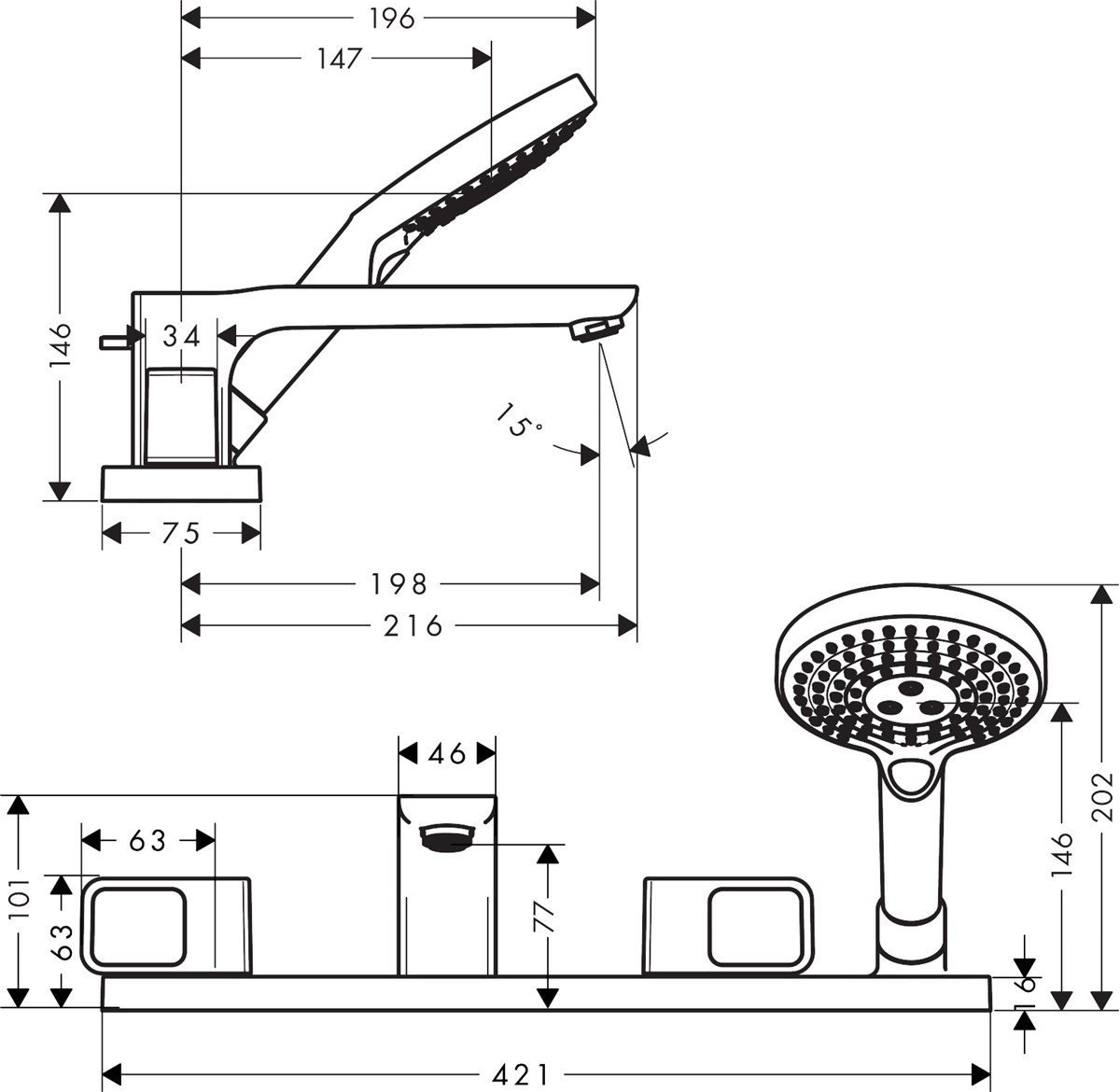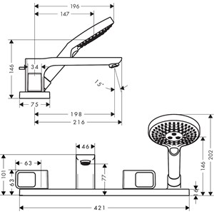 • består av: 4-håls badkarsblandare för kant, handdusch, duschslang, duschhållare