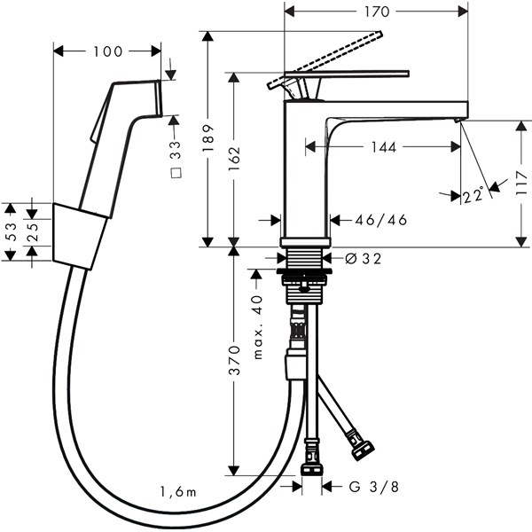 • består av: 1-grepps tvättställsblandare, bidettehanddusch, duschhållare, duschslang, bottenventil