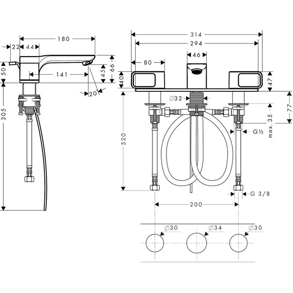 • består av: 3-håls tvättställsblandare, bottenventil