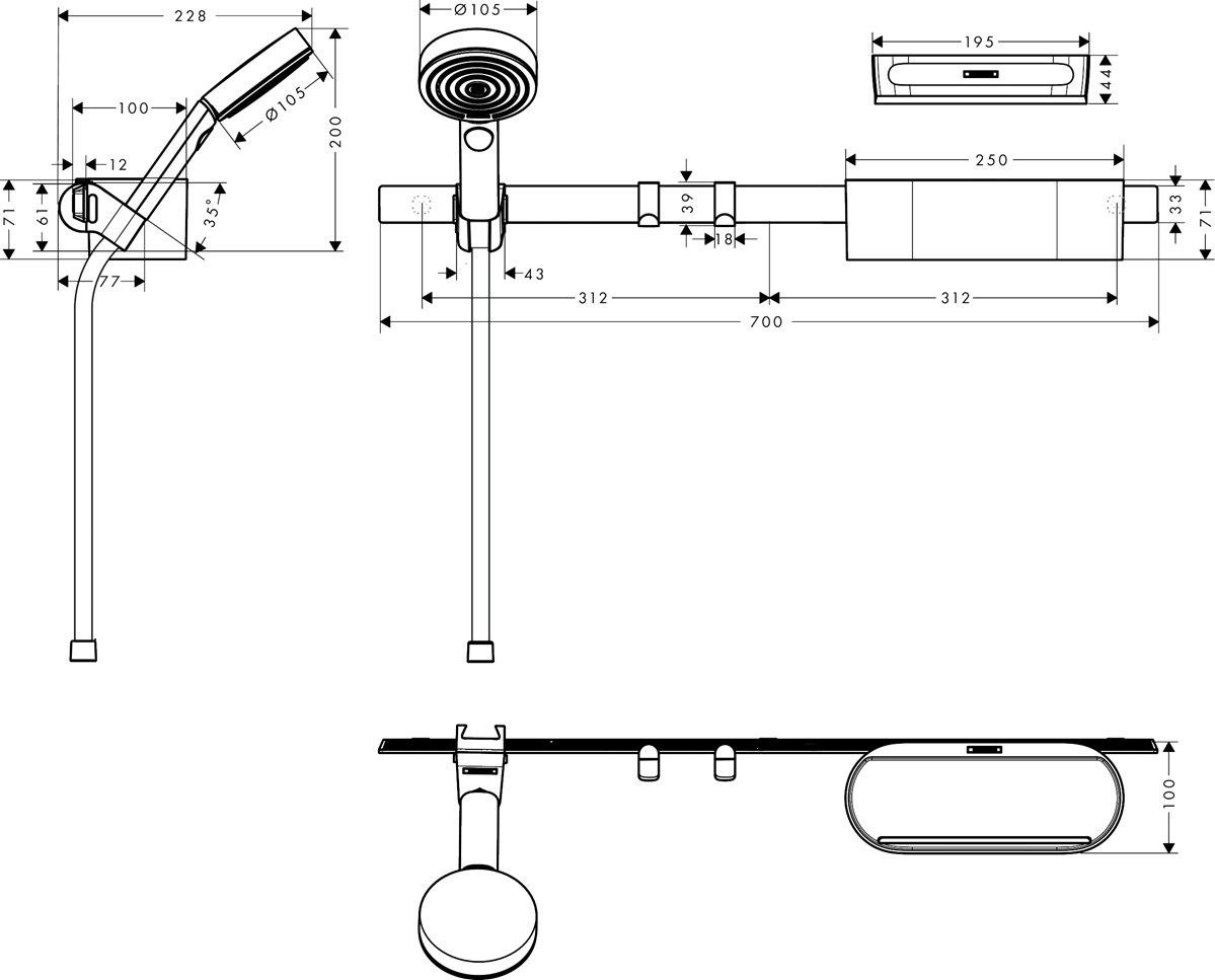 • består av: handdusch, duschslang, väggstång, förvaringskorg, handdukskrok, glidfäste, duschskrapa