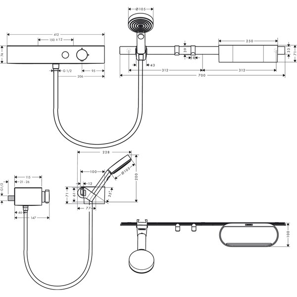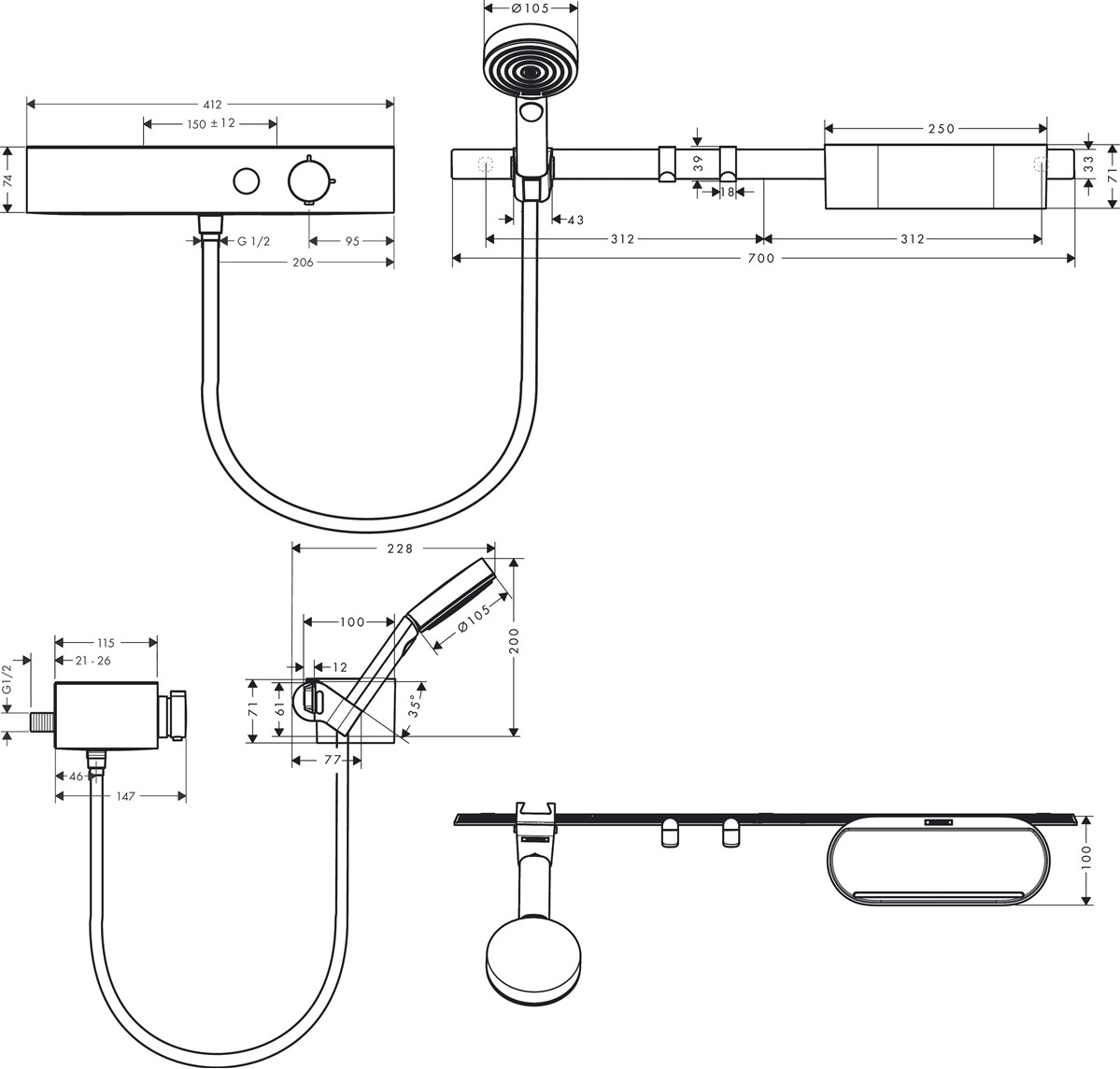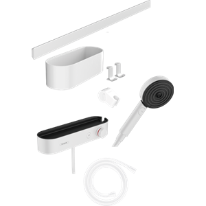 • består av: handdusch, duschtermostat, duschslang, väggstång, förvaringskorg, handdukskrok, glidfäste