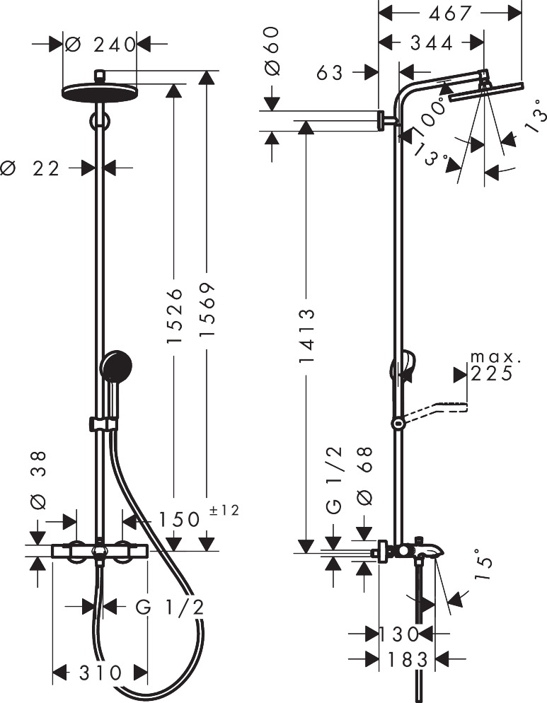 • duscharmslängd huvuddusch: 344 mm