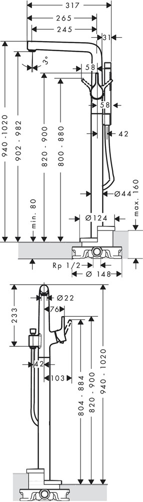 • består av: 1-grepps badkarsblandare för golvmontering, pinnhanddusch, duschslang, duschhållare