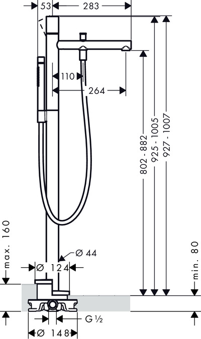 • består av: 1-grepps badkarsblandare för golvmontering, pinnhanddusch, duschhållare, duschslang