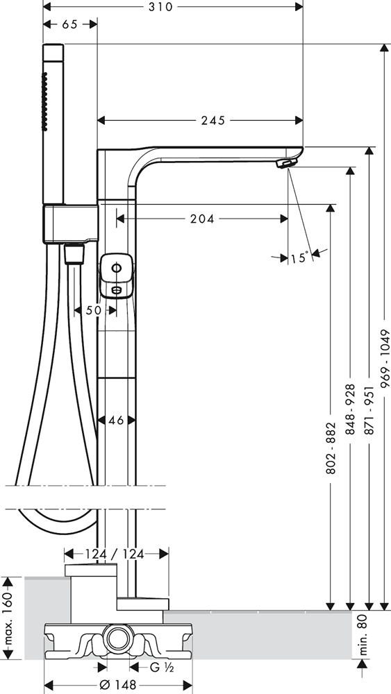 • består av: badkarstermostat för golvmontering, pinnhanddusch, duschslang, duschhållare