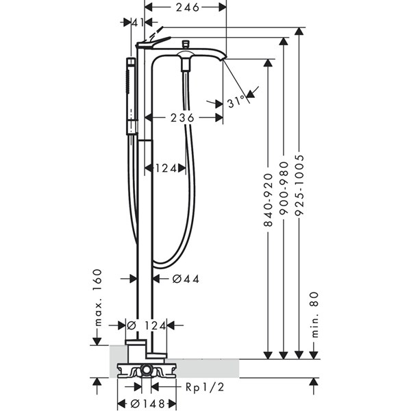 • består av: 1-grepps badkarsblandare för golvmontering, pinnhanddusch, duschslang, duschhållare