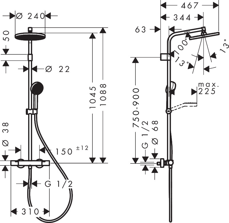 • duscharmslängd huvuddusch: 344 mm