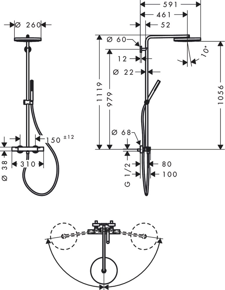 • duscharmslängd huvuddusch: 460 mm