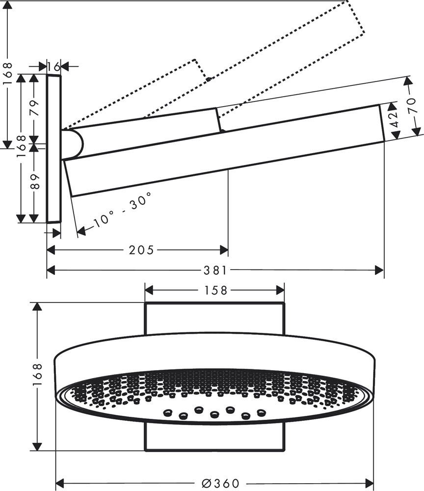 • duschhuvud kan justeras lodrät i vinkel med 10-30°