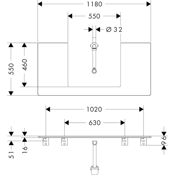 Xelu Q Bänkskiva 1180/550 med utskärning i mitten bänkmonterat tvättställ med sl