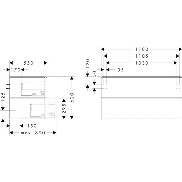 Xilesa E Kommod 1180/550 med 2 lådor bänkskiva med utskärning i mitten
