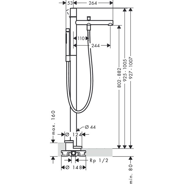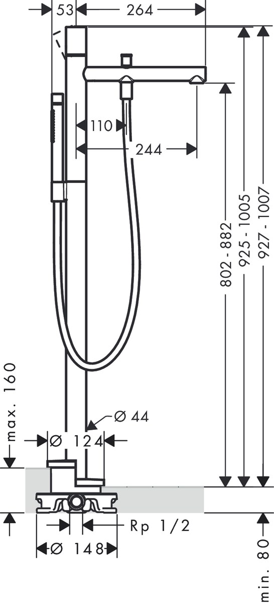 • består av: 1-grepps badkarsblandare för golvmontering, pinnhanddusch, duschhållare, duschslang
