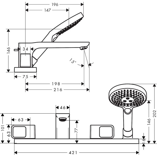 • består av: 4-håls badkarsblandare för kant, handdusch, duschslang, duschhållare