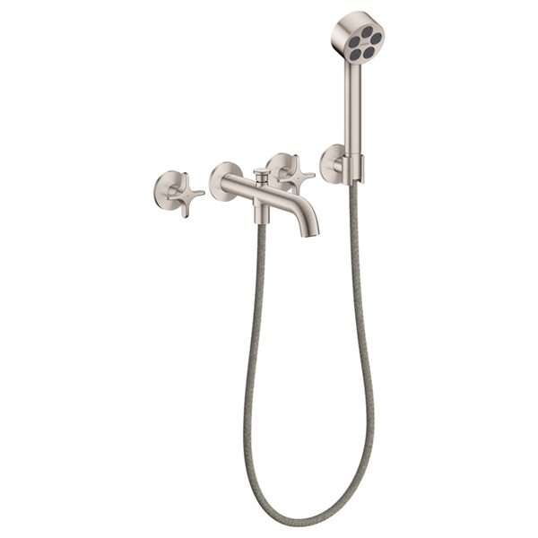 One 3-håls karblandare för inbyggnad vägg med krysshandtag och handdusch Rostfri finish