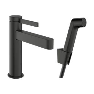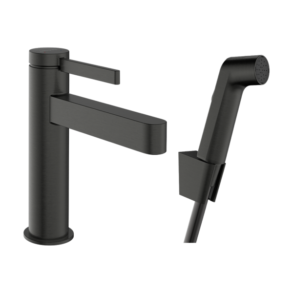 Finoris tvättställsblandare 110 med bidettehanddusch och 160 cm duschslang Borstad Svartkrom