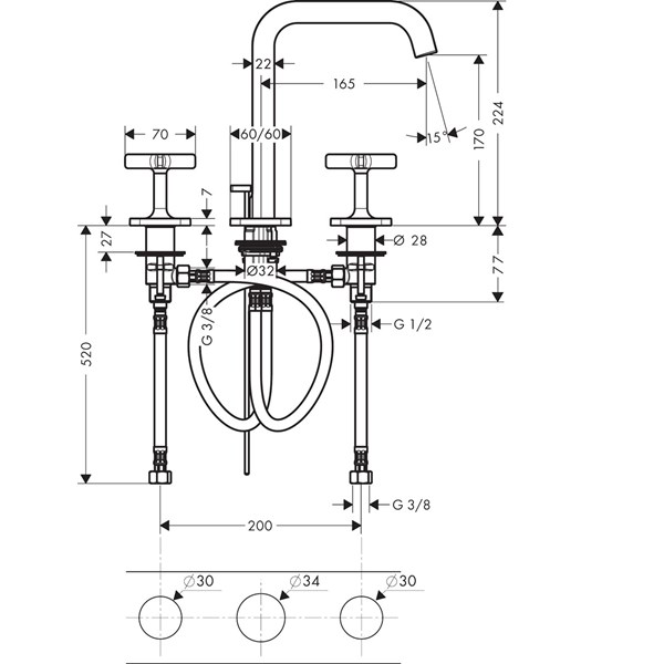 • består av: 3-håls tvättställsblandare, bottenventil