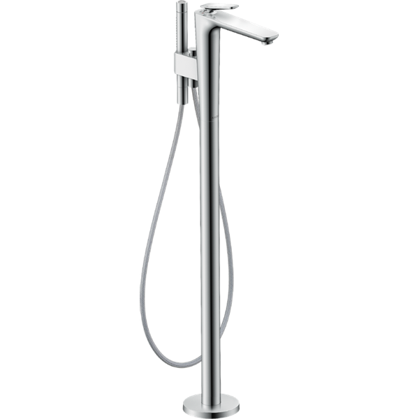 • består av: 1-grepps badkarsblandare för golvmontering, pinnhanddusch, duschslang, duschhållare