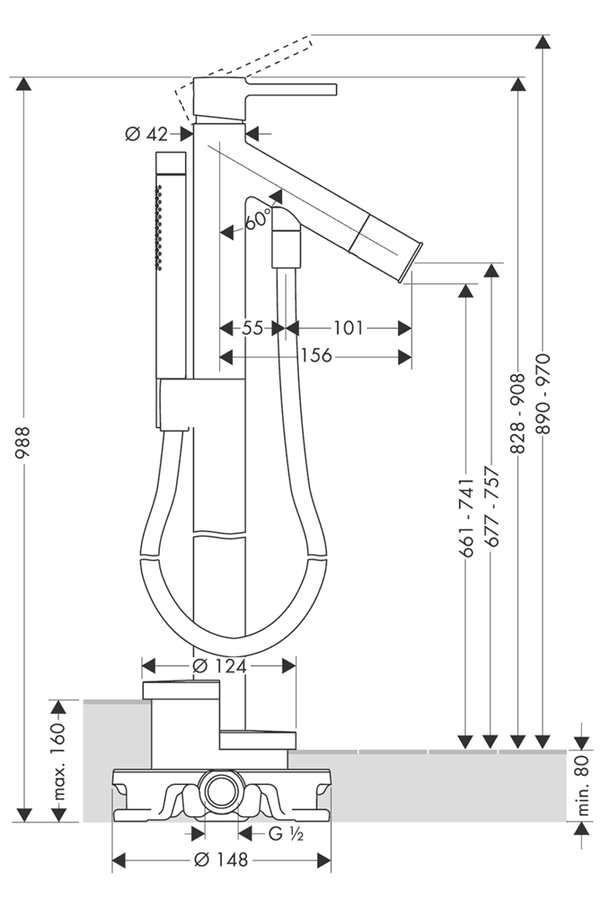 • består av: 1-grepps badkarsblandare för golvmontering, pinnhanddusch, duschhållare