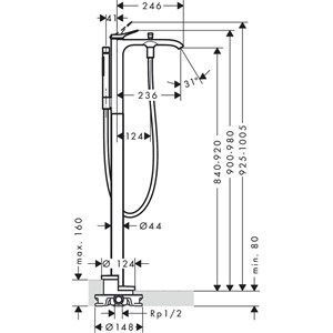 • består av: 1-grepps badkarsblandare för golvmontering, pinnhanddusch, duschslang, duschhållare