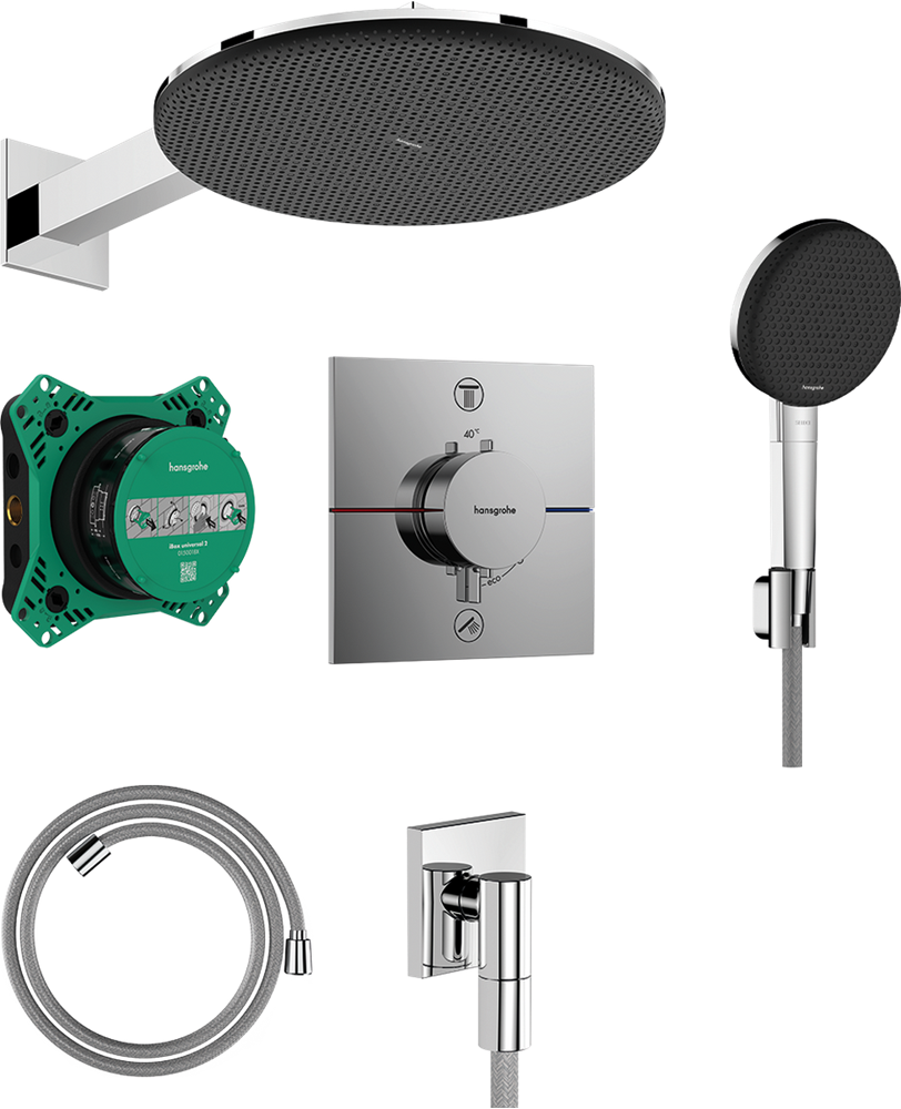 • består av: huvuddusch, duscharm, handdusch, duschhållare, vägganslutning, textilduschslang, duschtermostat, inbyggnadsdel