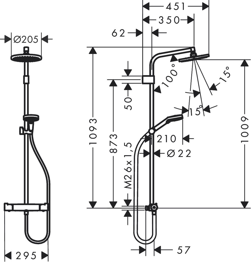 • duschhuvudsstorlek huvuddusch: 205 mm