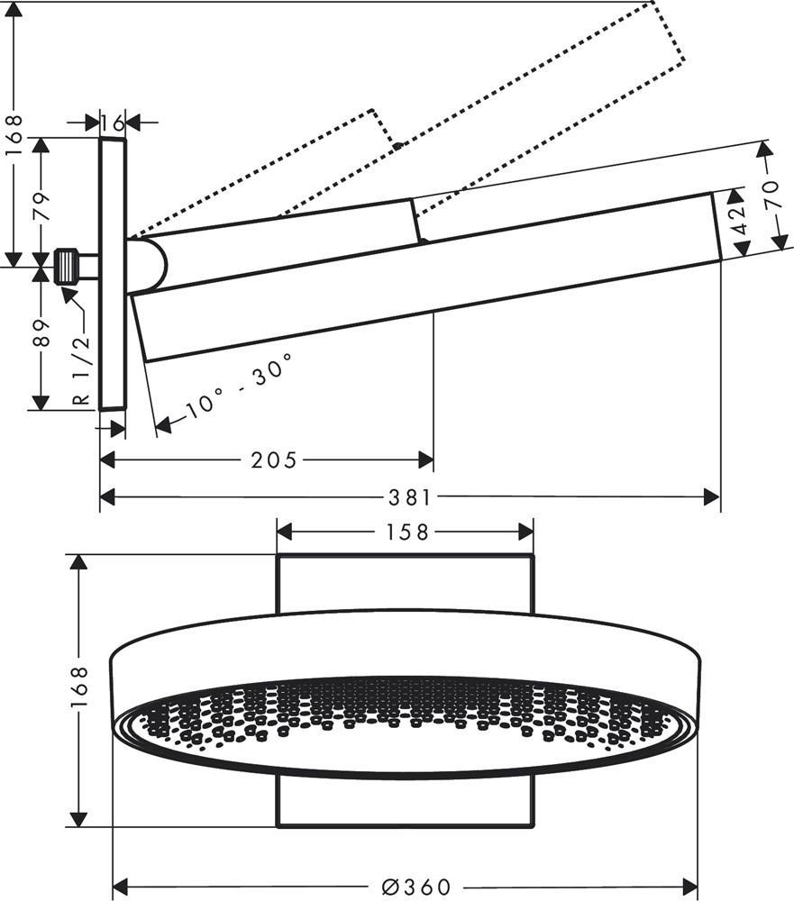 • duschhuvud kan justeras lodrät i vinkel med 10-30°