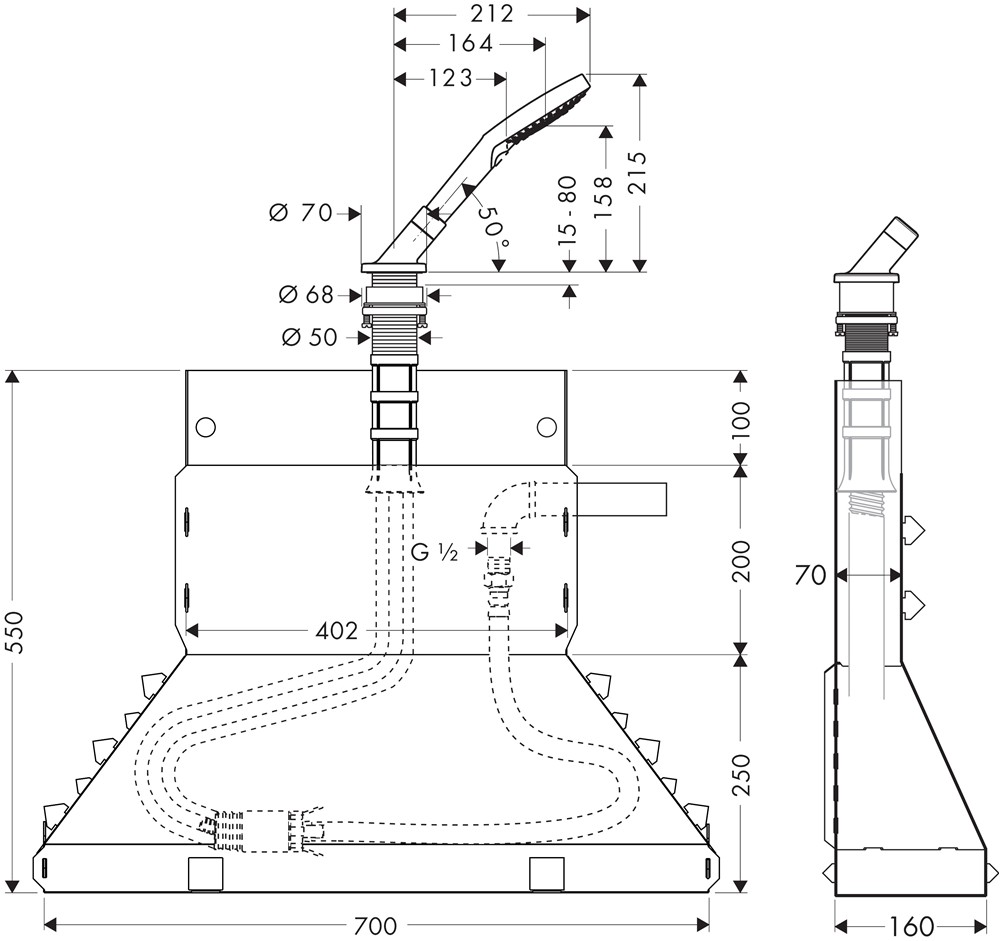 • består av: handdusch, duschhållare, duschslang, Secubox, Secuflex slangbroms, slanggenomföring