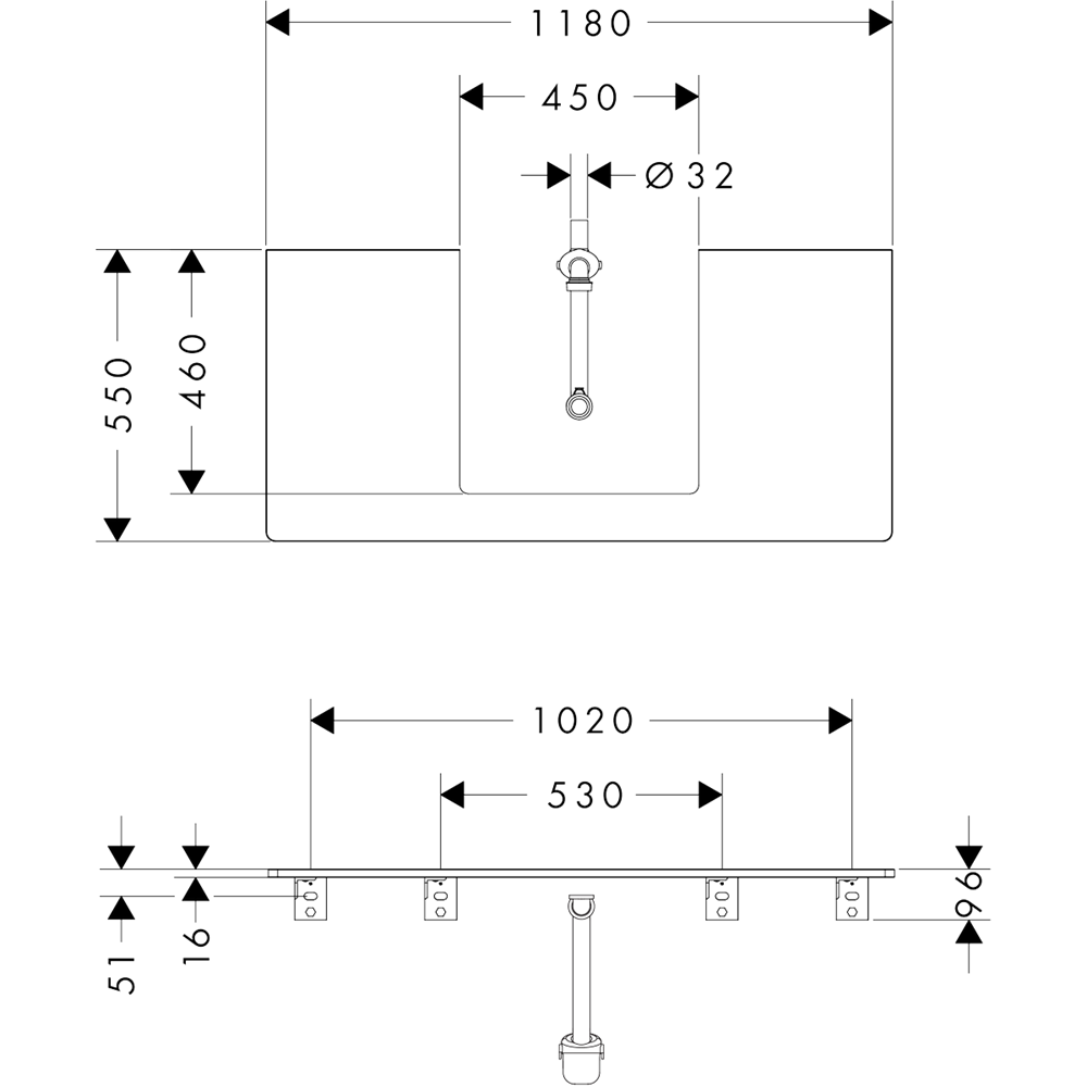 Xelu Q Bänkskiva 1180/550 för bänkmonterat tvättställ center 500/480