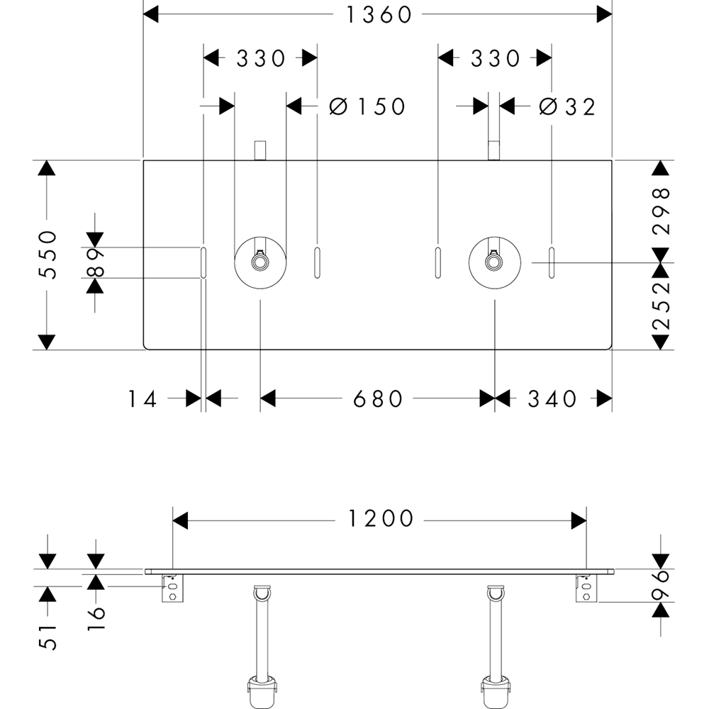 Xelu Q Bänkskiva 1360/550 för dubbelmontage tvättfat utan blandarhål