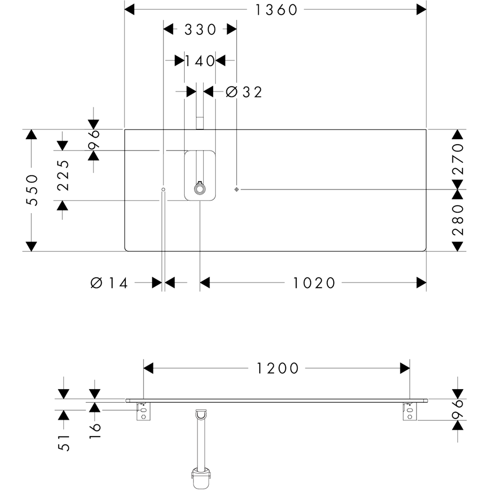 Xelu Q Bänkskiva 1360/550 för tvättfat utan blandarhål vänster