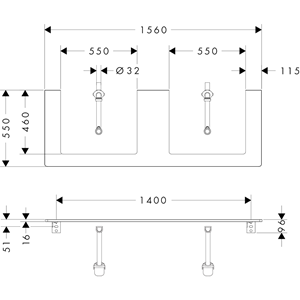 Xelu Q Bänkskiva 1560/550 med 2 utskärningar bänkmonterat tvättställ med slipad