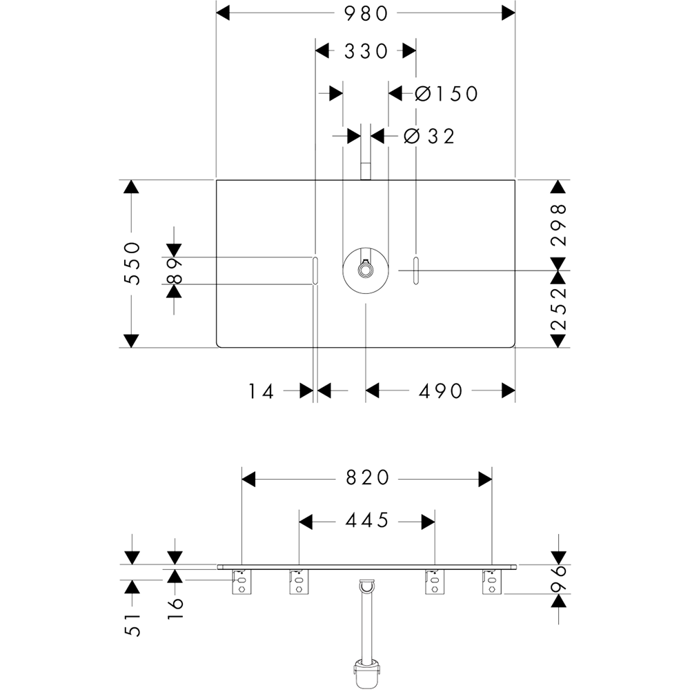 Xelu Q Bänkskiva 980/550 för tvättfat utan blandarhål center