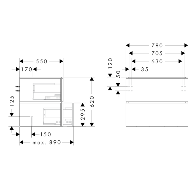Xilesa E Kommod 780/550 med 2 lådor PushOpen bänkskiva med utskärning i mitten