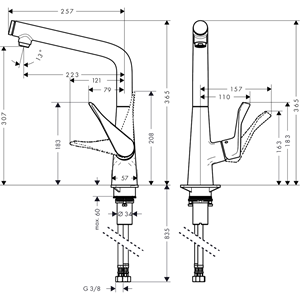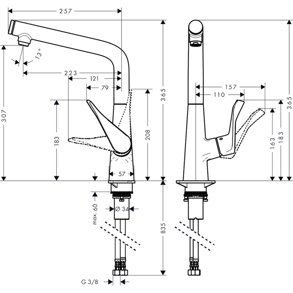• svängradie inställningsbar i 3 steg på 110°, 150° eller 360°