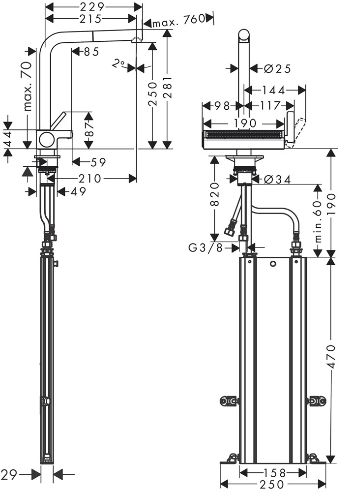 • svängradie inställningsbar i 3 steg på 60°, 110° eller 150°