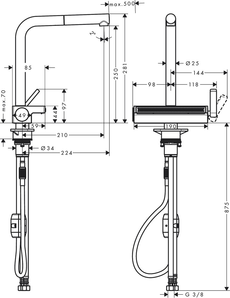 Aquno Select M81 köksblandare 250, utdragbar pip, 2jet Mattsvart
